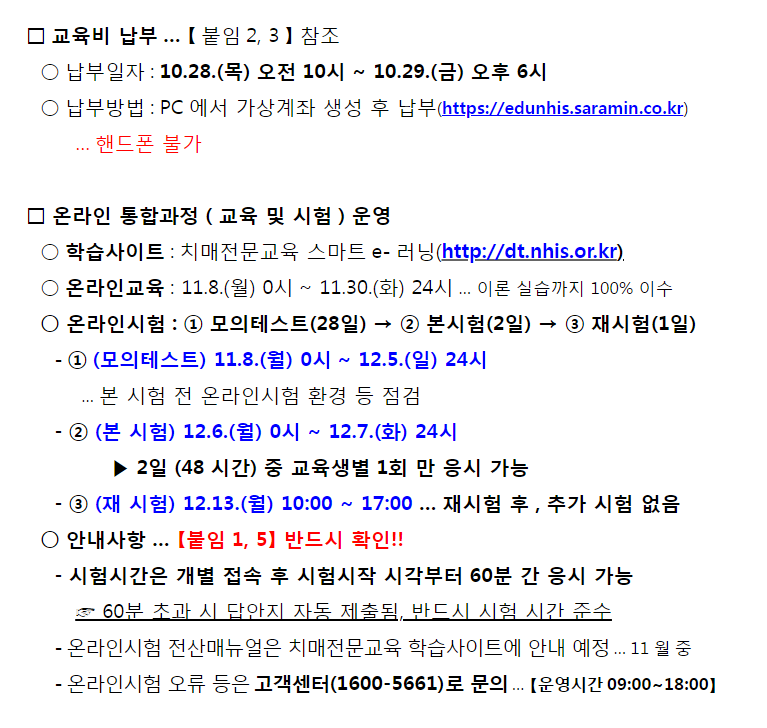 온라인 시험 : 12월 6일 월요일 0시 ~ 12월 7일 화요일 24시 (2일 중 교육생별 1회만 응시 가능)