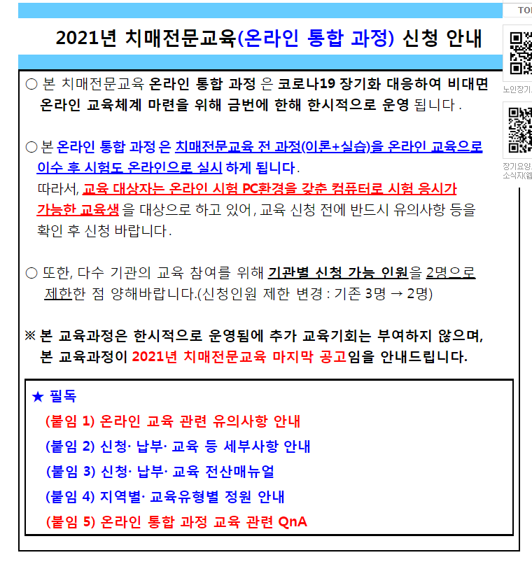 2020년 치매수급자 맞춤형 서비스 제공을 위한 우수종사자를 양성하고자 아래와 같이 장기요양기관 종사자 치매전문교육을 실시하니 많은 참여를 바랍니다. 치매전문교육 온라인공고 :: 납부기