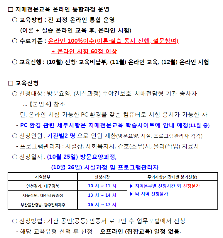 2021년 10월 특별 치매전문교육 신청 접수 일정 안내
